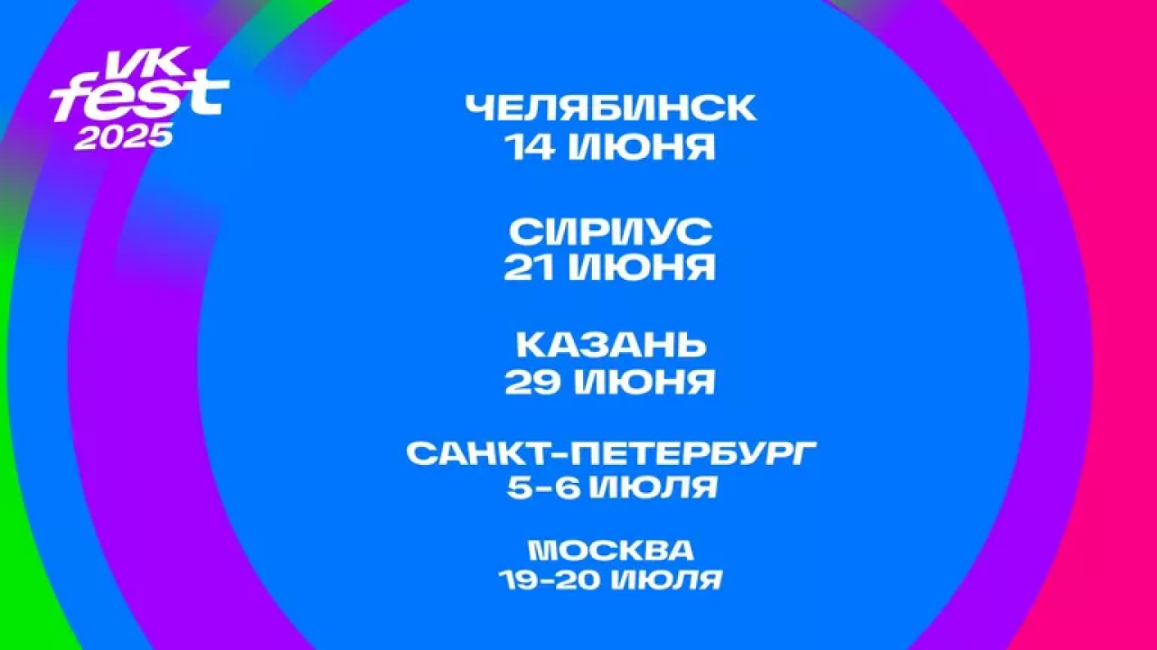 В 2025 году VK Fest пройдёт с 14 июня по 20 июля. Фестиваль объединит Казань, Челябинск, Сириус, Санкт-Петербург и Москву.