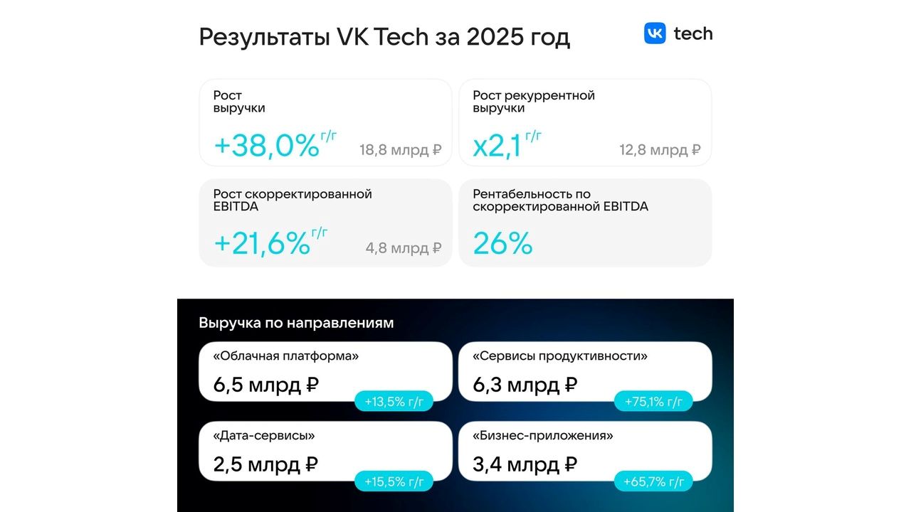 Выручка VK Tech за 2025 год выросла на 38% год к году до 18,8 млрд рублей